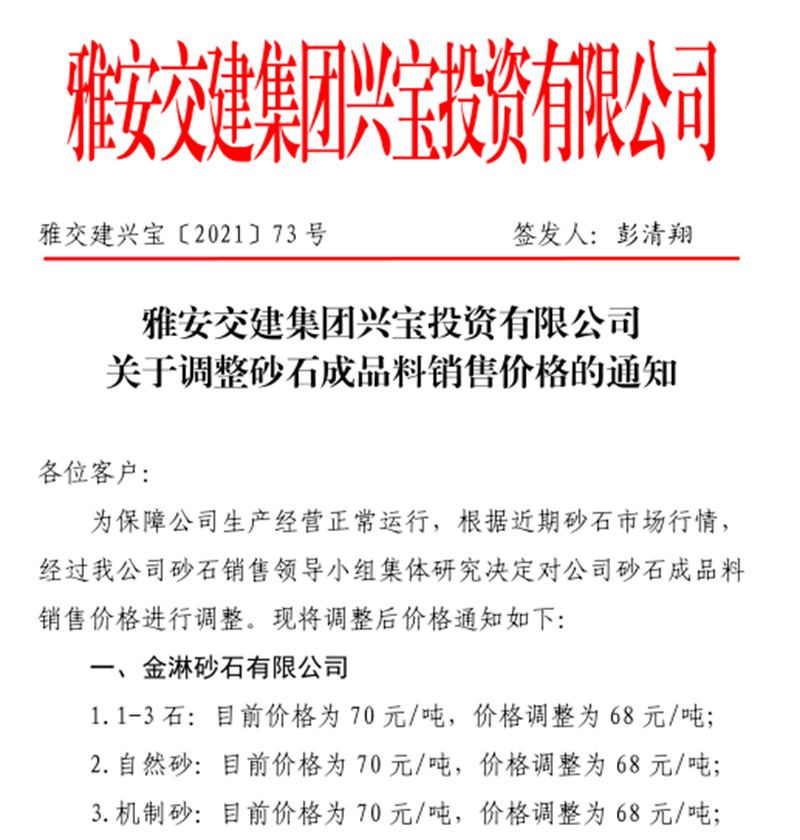 雅安交建集團云石公司關(guān)于調(diào)整成品料銷售價格的通知(2021.11.4)