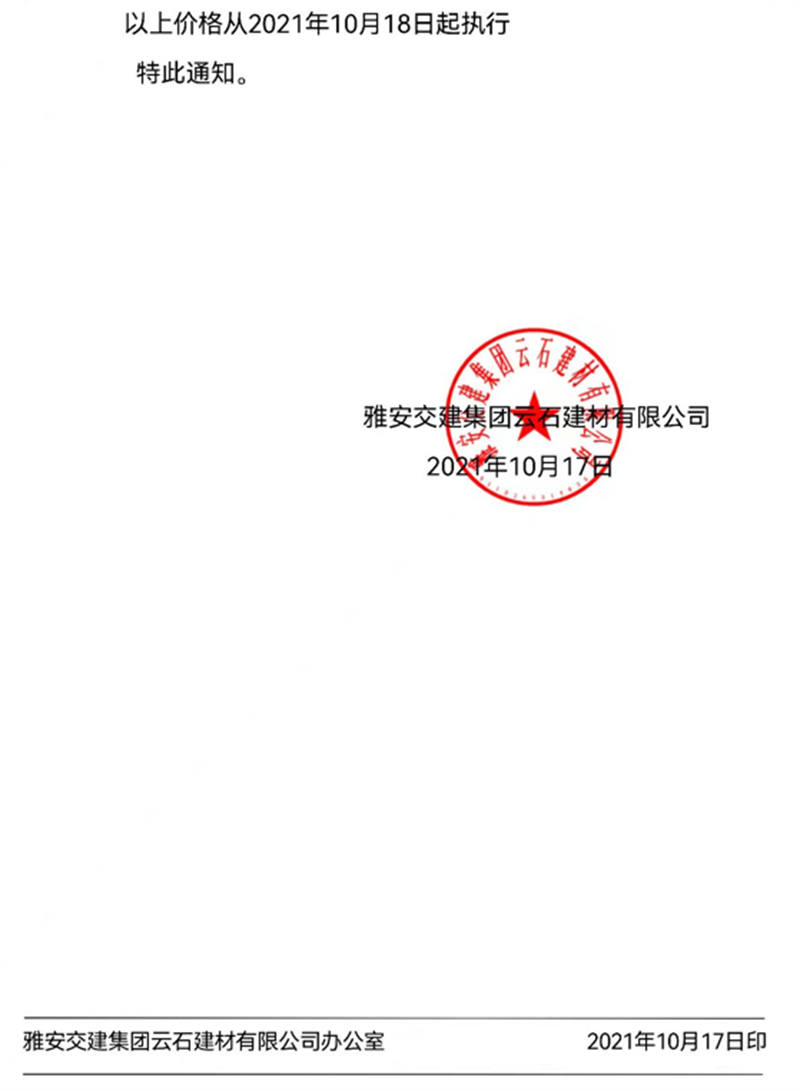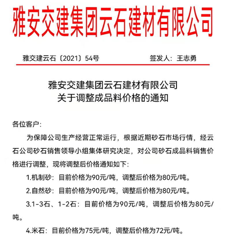 雅安交建集團云石公司關(guān)于調(diào)整成品料銷售價格的通知(2021.10.17)