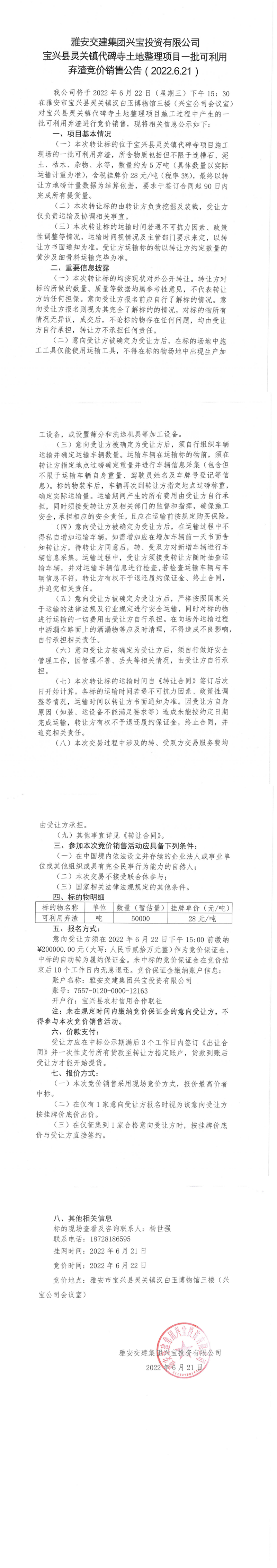 雅安交建集團(tuán)興寶投資有限公司寶興縣靈關(guān)鎮(zhèn)代碑寺土地整理項(xiàng)目-批可利用 棄渣競(jìng)價(jià)銷(xiāo)售公告( 2022.6.21)