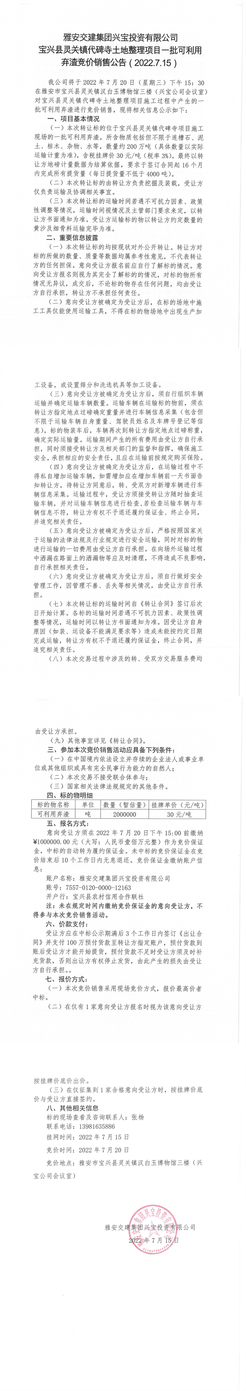 寶興縣靈關鎮(zhèn)代碑寺土地整理項目一批可利用棄渣競價銷售公告7.15(200萬噸)