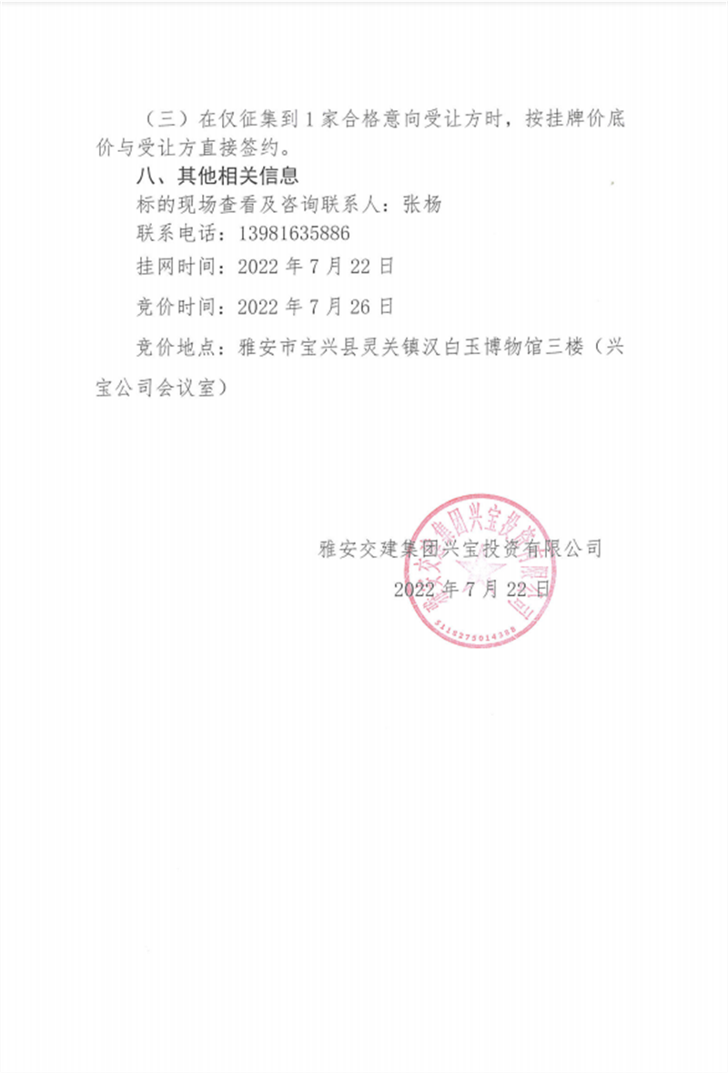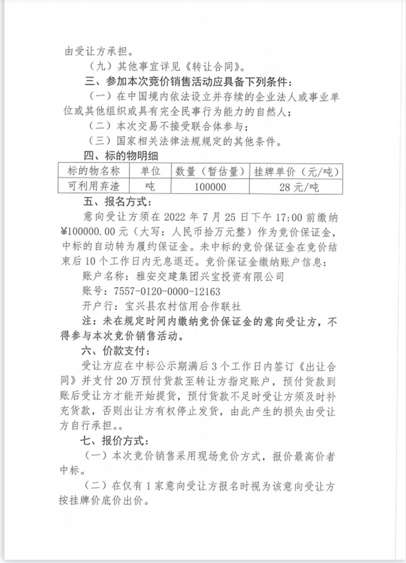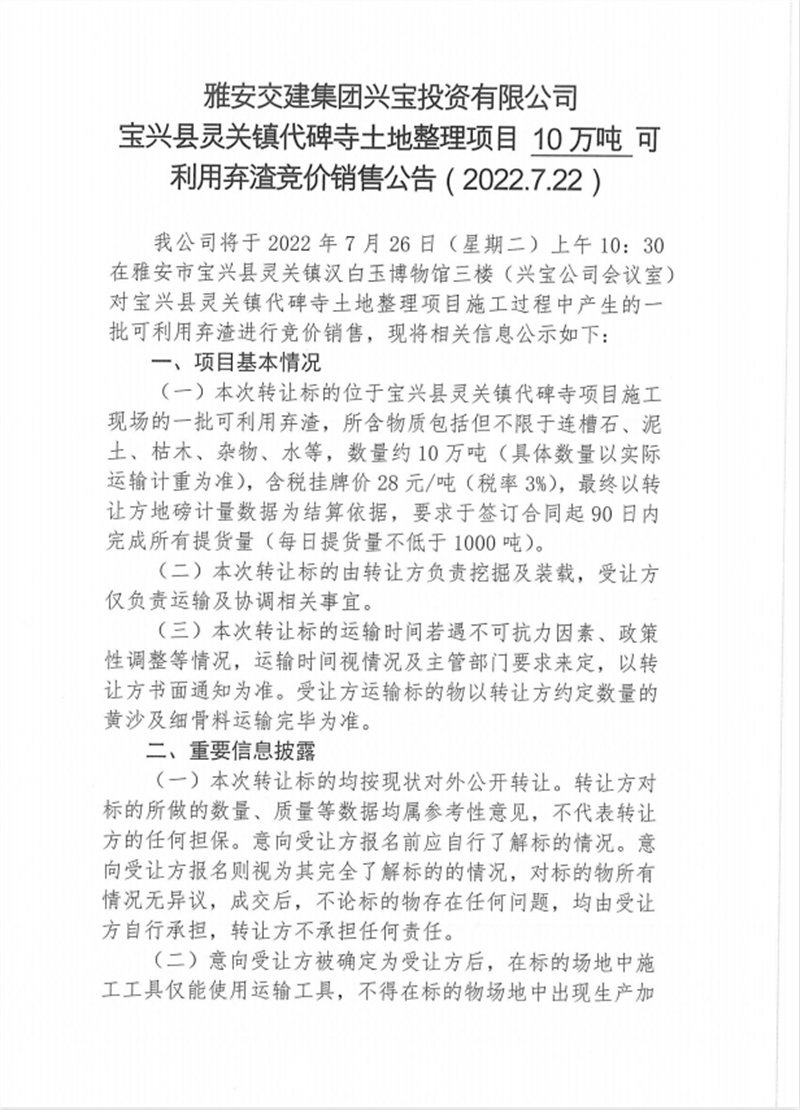 興寶公司寶興縣靈關(guān)鎮(zhèn)代碑寺土地整理項(xiàng)目10萬(wàn)噸可利用棄渣競(jìng)價(jià)銷售掛網(wǎng)公告掛網(wǎng)公告7.22(5萬(wàn)噸)