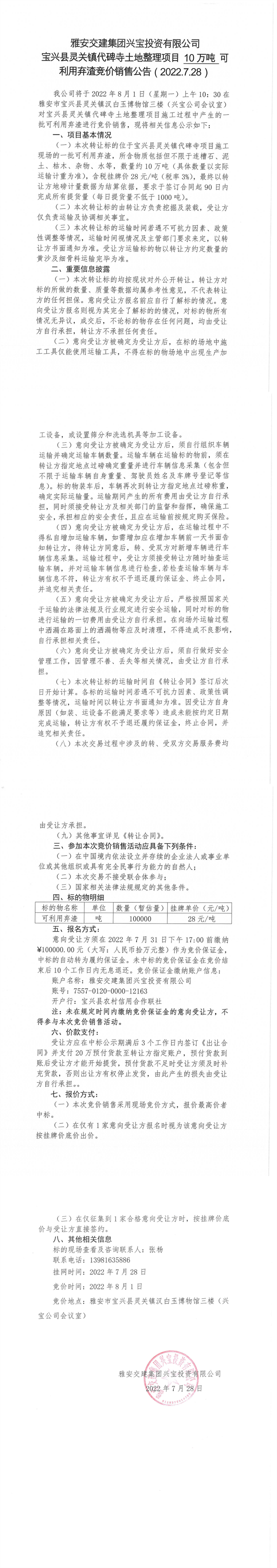 雅安交建集團(tuán)興寶投資有限公司靈關(guān)鎮(zhèn)代碑寺土地整理項(xiàng)目5萬噸可利用棄渣競(jìng)價(jià)銷售成交公告(2022.8.1)