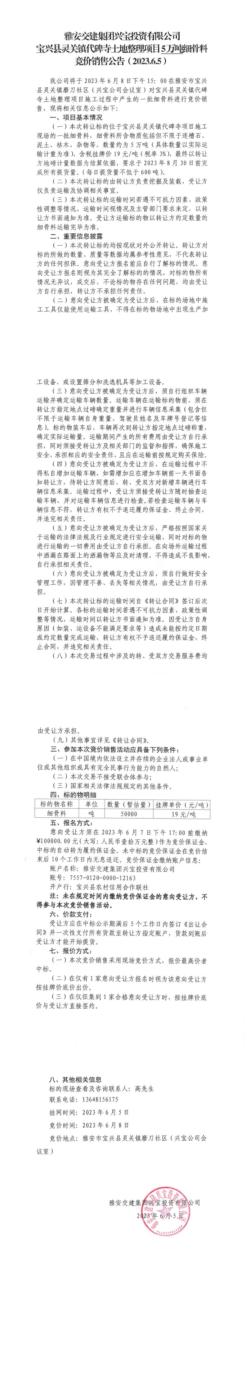 雅安交建集團(tuán)興寶投資有限公司寶興縣靈關(guān)鎮(zhèn)代碑寺土地整理項(xiàng)目5萬噸細(xì)骨料競價(jià)銷售公告(2023.6.5)